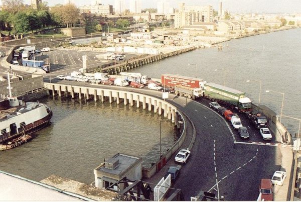 of the Woowich Ferry showing the queue for the boats.