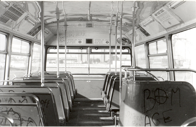 The top deck of another of the buses, complete with graffiti heading over the river. Perhaps to a new life overseas after a spell at Ensigns.