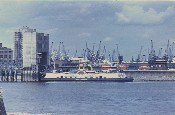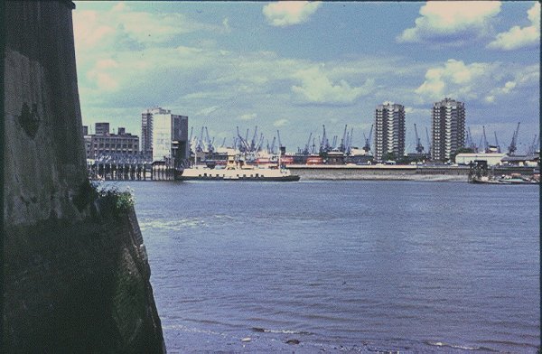 A closer view of the James Newman, behind can be seen buses waiting at the North Woolwich terminal. The small domed building is the northern entrance to the foot tunnel opened in 1912. The once animated cranes of the Royal Docks have since gone, the docks are now downstream at Tilbury. Goods are then brought into London by road, while the river is almost empty.