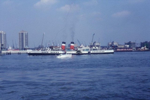 The PS Waverley, the last sea going paddle steamer in the world. Heading for London on the Thames at Woolwich. Waverley is still in service today.