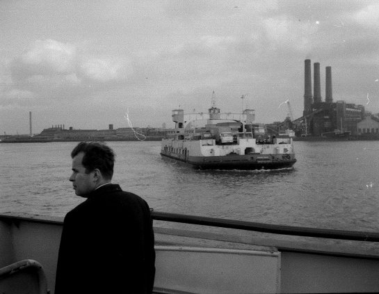 Looking from one ferry to another in mid stream. The view is of the southern shore with views of Woolwich Power Station and the Royal Arsenal.